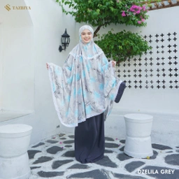 • Mukena Kombinasi Dzelila merupakan model mukena dengan bagian atasan bermotif dan rok mukena menggunakan warna solid.